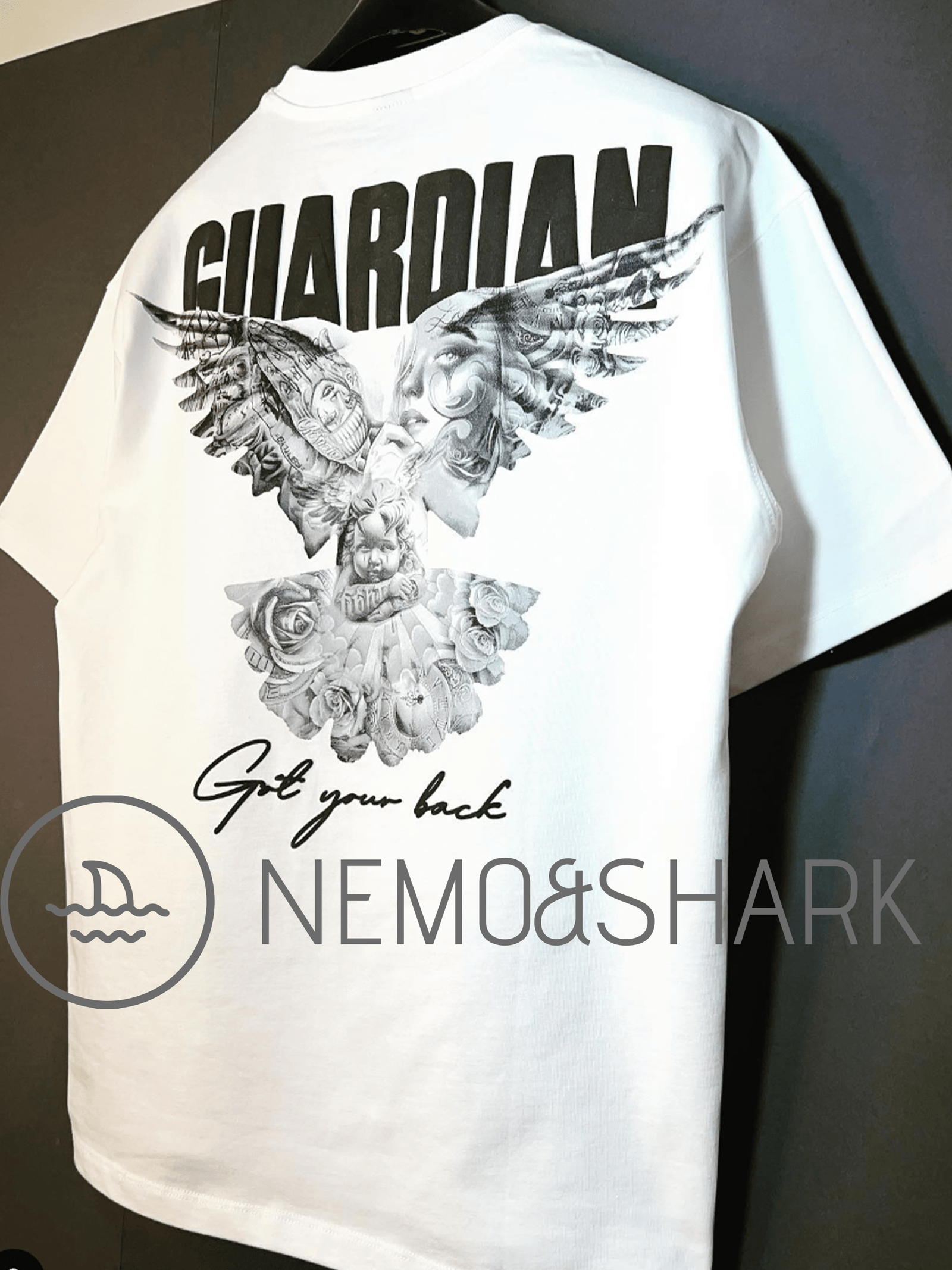 تيشيرت اوفر سايز بتصميم صورة لطائر ملاكي على الظهر يوحي بالحماية